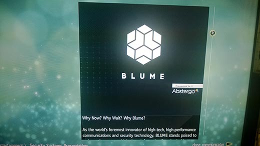 Sunumda adı geçen BLUME şirketi, Watch_Dogs'da ctOS'u yapan şirket ve Abstergo'ya ctOS'u pazarlamaya çalışıyor. Aynı logo ve isimle, Watch_Dogs'a "BLUME Agent Pack" adı altında bir DLC de duyurulmuştu. Bu da Watch_Dogs ile Assassin's Creed'in kesin olarak aynı evrende geçtiğini ispatlıyor.