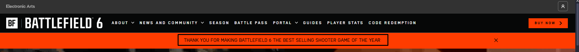 Battlefield'ın resmi sitesine girdiğinizde, tepede ufacık bir yazı beliriyor. Aşağıya eklediğim görüntüde görebileceğiniz gibi EA, "Battlefield 6'yı yılın en çok satan shooter oyunu yaptığınız için teşekkürler" notunu en tepeye sabitlemiş. Tabii elimizde resmi bir veri bulunmuyor.