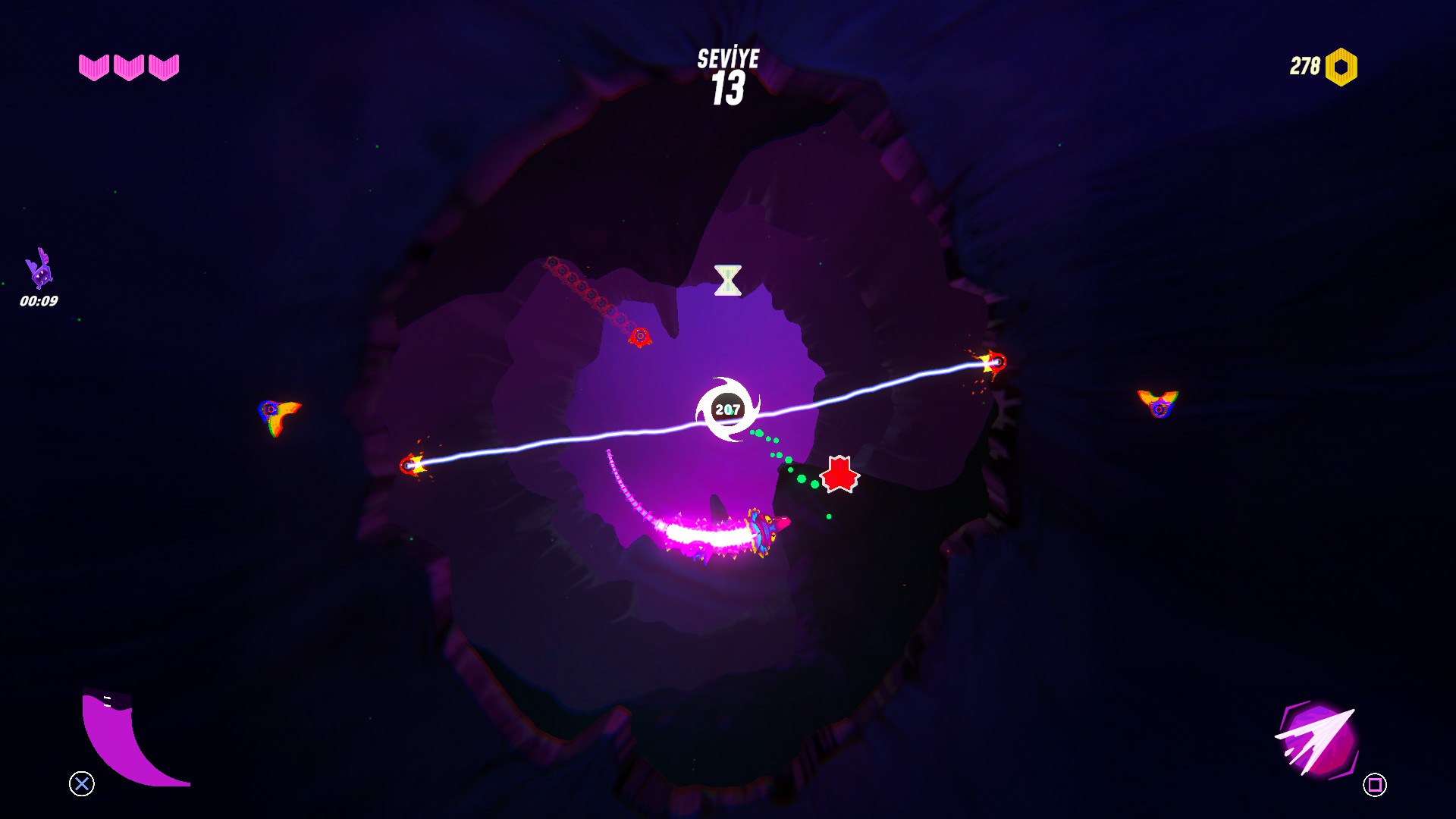 Ama benim en sevdiğim kırmızı roketler oldu. Kırmızı ikonu kaptığınızda küçük bir roket çıkıp üstünüze gelen düşmancıklardan birini yok ediyor.