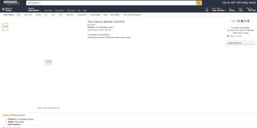 Ben bu haberi yazarken Amazon Kanada’da Ubisoft tarafından Tom Clancy's Splinter Cell 2018 diye bir ilan açıktı. Siz haberi okuduğunda link kaldırılmış olabilir diye ekran görüntüsünü aşağıya da koyuyorum.