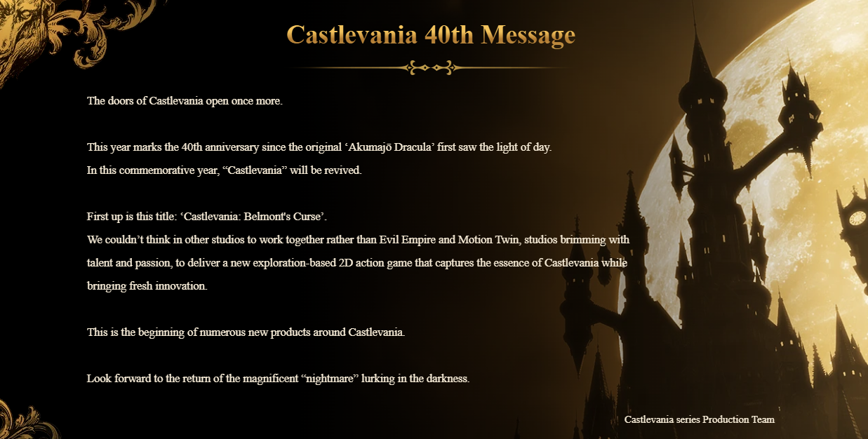 Konami, kendi sitesinde yaptığı açıklamada ise çok daha özel ifadeler kullanıyor. Serinin bu sene "tekrar dirileceğini" söyleyen Castlevania ekibi, "bu sadece bir başlangıç" ifadelerini de kullanmış.