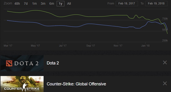 Geçen sene şubat ayının sonunda 960 bin günlük oyuncuya ulaşan Dota 2, bu ay itibariyle 640 bin günlük oyuncuya kadar düştü. CS:GO da böylelikle son birkaç aydaki tırmanışıyla, Dota 2’yi geride bırakmış oldu.