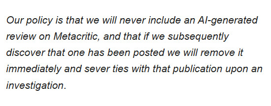 Metacritic kurucu ortaklarından Marc Doyle konuya dair bir açıklama paylaştı ve oyun basınına yapay zeka üretimi incelemelerin yasaklandığını ve tespit edilenlerin kaldırılacağını bildirdi.