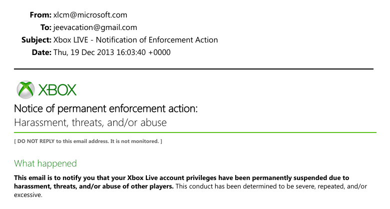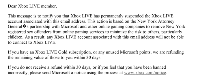 Gönderilen ikinci mail'de ise bu kararın nedeni daha detaylı halde şöyle açıklanıyor: "Bu işlem, New York Başsavcılığı'nın Microsoft ve diğer çevrimiçi oyun şirketleriyle, başta çocuklar olmak üzere başkalarına yönelik riski en aza indirmek amacıyla New York'ta kayıtlı cinsel suçluları çevrimiçi oyun hizmetlerinden uzaklaştırmak için kurduğu ortaklığa dayanmaktadır. Sonuç olarak, bu e-posta adresiyle ilişkili hiçbir Xbox LIVE hesabı Xbox LIVE'a bağlanamayacaktır."
