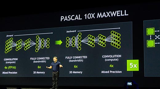Pascal, Nvidia CEO’su Jen-Hsun Huang’ın altını çizdiği üzere üç önemli özelliğe sahip. Bir GPU’da veri yolunu arttırmak ya da kapasiteyi arttırmak kendi başlarına kolay olsa da ikisini aynı anda arttırmak oldukça zor. Ama 3D Memory özelliği, bu konuda çözüm sunuyor ve Pascal sayesinde iki aşamayı birden arttırarak performans gelişimi net şekilde belli olacak. İkinci özellik, adı daha önce anılmış olan NVLink özelliği. Birçok GPU’yu birbirine bağlayan (ki Pascal 8 kartı SLI olarak bağlama imkânı sunacak) bu sistem ve Nvidia’nın 3D Memory becerisiyle kolektif 32 GB belleğe ulaşabiliyor. Ki bu da Titan X’in yaklaşık 3 katı. Son olarak Mixed Precision denen sistemi, kendi içinde daha yüksek bir verim almasını sağlıyor Pascal’ın.
