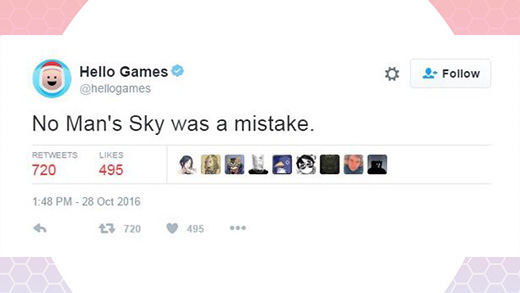Bildiğiniz gibi büyük bir merakla beklenen No Man's Sky'ın çıkışı beklentilerin hayal kırıklığına dönüşmesine neden olmuştu. Bir anda çok yoğun eleştiriler geldi, incelemeler kötüydü, bir çok oyuncu oyunu iade etmek üzere başvurmuştu. Tüm bunlar olurken oyunun geliştiricisi Hello Games sessizliğini korudu. Korudu. Korudu. Ve aylar sonra geliştiricinin Twitter hesabından atılan ilk mesaj da işte bu oldu: "No Man's Sky bir hataydı."