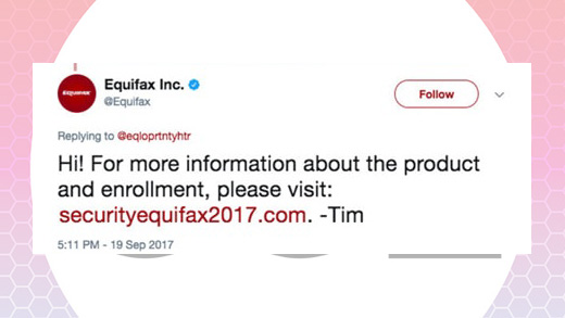 Firma bunun üzerine hemen Twitter üzerinden destek hattı açtı ve yukarıda gördüğünüz adresi verdi. Yalnız Equinax'ın açmış olduğu destek sayfasının adresi equifaxsecurity2017'ydi, tweette yazan adres değil. Dahası, tweetteki adres bir 'olta' sitesine aitti, yani asıl sayfanın benzerini yapıp kullanıcı bilgileri çalmak için kurulmuş olan bir siteydi. Uyarılara rağmen yanlış adresle üç tweet daha attılar, ancak ondan sonra hatalarını fark ettiler. Sorsan siber güvenlik.