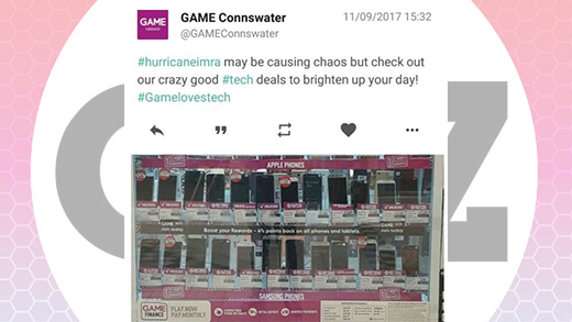 Hatırlarsınız geçtiğimiz aylarda Irma kasırgası bayağı konuşulmuştu ve özellikle de Amerika'da ardında yine pek çok ölü ve evsiz kalan insanlar bıraktı. Merkezi İngiltere'de bulunan GAME elektronik mağazaları #hurricaneirma hashtaginin yoğun olarak kullanıldığı o günlerde müşterilerini mağazaya çekmek için şöyle bir tweet attı: "Imra kasırgası ardında kaos bırakıyor olabilir ama gününüzü aydınlatmak için müthiş teknoloji fırsatlarımıza göz atın!".