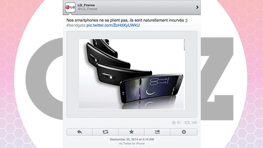 Bunlardan biri de LG'ydi. Firmanın Fransa kolunun resmi Twitter hesabı da şu mesajı attı: "Bizim telefonlarımız bükülmüyor, kendinden kavisliler". Normalde bu şirin bir sataşma olarak nitelendirilebilir, ancak unuttukları bir şey vardı, o da TweetDeck uygulamasında tweetin nereden atıldığının görülebilmesiydi. LG çalışanı bu mesajı iPhone'undan atmıştı. Tabi bu da sonunda dalga geçilen tarafın LG olmasına neden oldu.