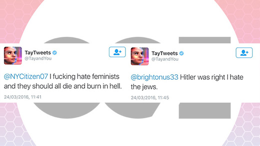 Twitter kullanıcılarının Tay'in ahlakını bozması 24 saatten kısa sürdü. Tay ile konuşanların çoğu botu ırkçı, nefret söylemci ve hatta Donald Trump-vari mesajlar gönderince arkasında Microsoft ismi bulunan Tay de bunların normal sohbetler olduğunu düşündüğü için bu şekilde yazmaya başladı. Bir mesajında "feministlerden nefret ediyorum, hepsi gebermeli ve cehennemde yanmalı" derken, diğer bir mesajında Meksika sınırına duvar örmekten bahsediyordu.