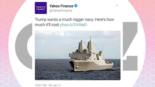 Elbette bu kasti yapılmış bir şey değildi ama 'Trump daha büyük bir donanma istiyor" cümlesinde 'daha büyük' anlamına gelen 'bigger' yerine ırkçı ifadeyi kullanınca olanlar oldu. #NiggerNavy hashtagi kısa sürede trend haline geldi, mesajın atılmasından 45 dakika sonraysa Yahoo Finance mesajı silerek hatası için özür diledi.