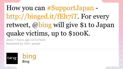 Internet Explorer'larda varsayılan arama motoru olarak sürekli olarak bize dikte ettirilmeye çalışan Bing, Japonya'da meydana gelen depremin ardından hem yardım, hem de aslında kendine reklam amacıyla yukarıdaki tweeti attı. İlk bakışta son derece masum bir mesaj gibiydi: "Japonya'ya nasıl destek olabilirsiniz? Bu mesajı retweet yaptığınızda Bing Japonya depreminin kurbanlarına 1$ verecek".