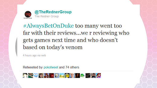 The Redner Group, Jim Redner'ın kurmuş olduğu tek kişilik bir halkla ilişkiler firması ve bu firmanın en büyük müşterisi de Duke Nukem Forever'dı. -di'li geçmiş zaman kullanıyorum çünkü yukarıda görmüş olduğunuz Tweet sonrası 2K Games, Redner Group ile olan ilişkisini kesti.