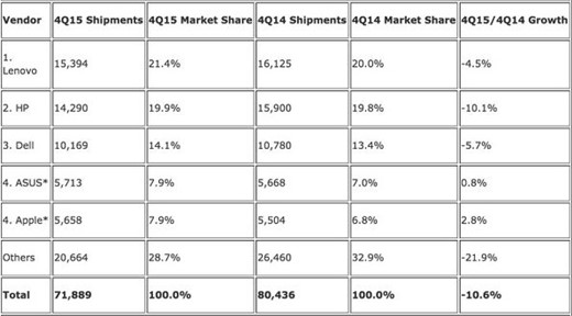 Teknoloji sektörünün önde gelen analistlerine göre PC pazarı, 2015'in dördüncü çeyreğinde yüzde 10'luk bir düşüş yaşadı. Bir dönem sektörde büyük pay sahibi olan HP'nin büyük zararlara uğraması, tarihi düşüşte beklenen daha etkin bir rol oynadı. Pazarın lideri Lenovoyüzde 5,4'lik bir kayıp yaşarken, söz sahibi diğer bir firma Dell ise yüzde 5,7'lik düşüşle en çok zararı alan üçüncü firma oldu.