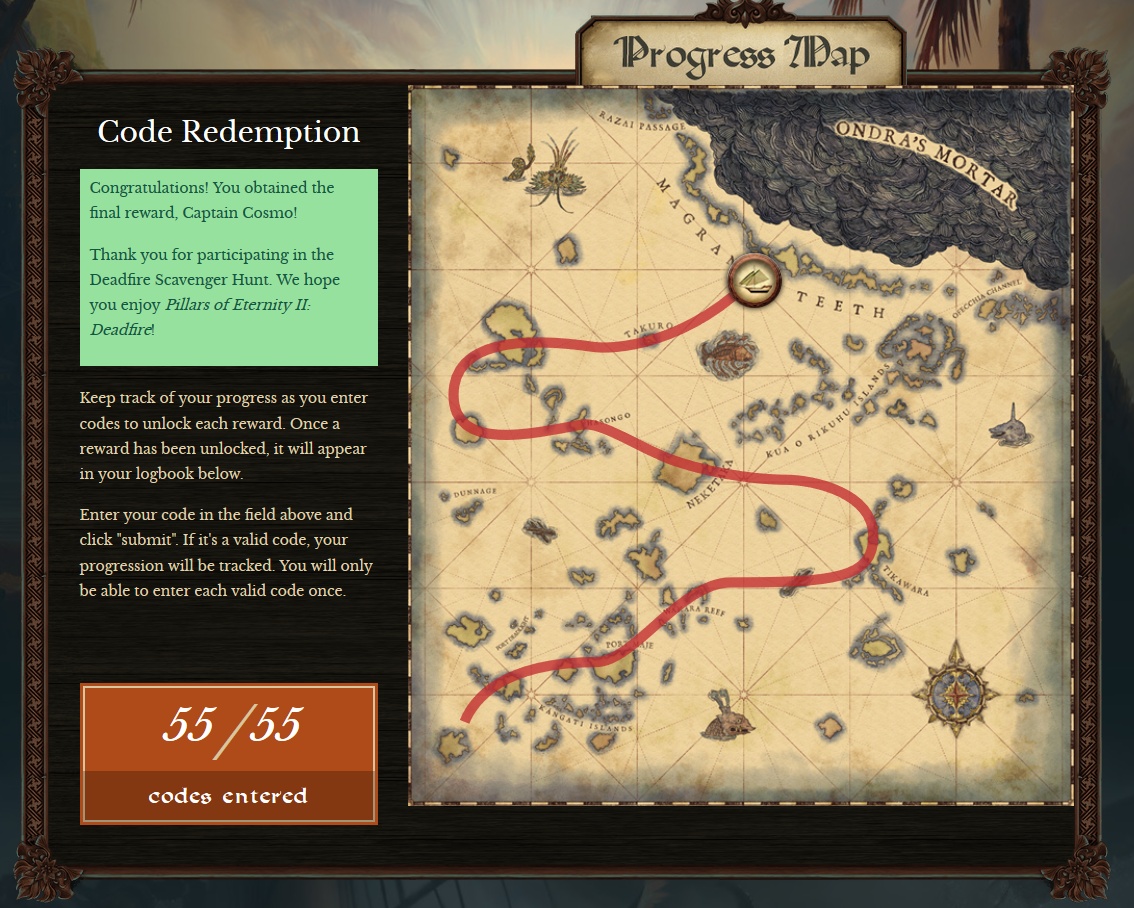 Bu oyuna dilediğiniz yerden katılmanız mümkün, çünkü kodları girmek için zaman sınırınız yok. Bunun için tek yapmanız gereken Obsidian'ın Scavenger sayfasına giriş yapmak ve Steam hesabınızı Obsidian hesabınıza bağlamak. Scavenger sayfasında kodları başarıyla girdikçe oyun için çeşitli hediyeler açmaya başlıyorsunuz. Örneğin 1 kod size Scavenger's Lantern eşyası kazandırırken, 20xGrog hediyesi için 2 kod daha bilmeniz gerekiyor. Stinky Pete kediciği 3 kod daha gerektiriyor mesela. Toplamda 10 hediye var ve bulunması gereken kod sayısı da 55.