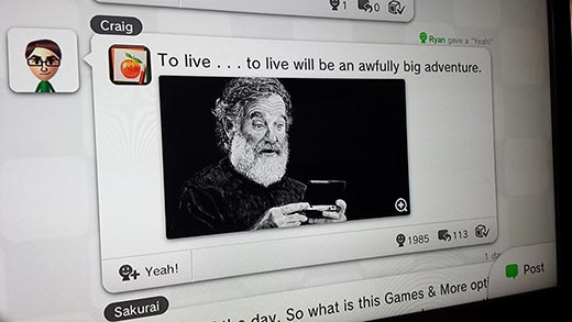 Ama bu kadar derine girmenin bir anlamı yok, laflar çok yüzeysel kalacak. Onun yerine Wii U kullanıcısı Craig’in yaptığı çalışmaya bakmak daha uygun olacaktır. Miiverse’teki Art Academy’de yaptığı çalışmayla Craig Robin Williams’a başka bir dünyada “hayat vermiş” oluyor aslında. Aşağıda hem Miiverse’teki göründüğü halini hem de ekran görüntüsü alınmış halini görebilirsiniz.