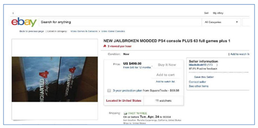 Şu an için firmware'i 5.05'e kadar olan PS4'ler kopya oyun çalıştıracak şekilde modlanabiliyor ve bu işle uğraşanlar kırık PS4'leri içleri oyun yüklü biçimde sıkça satışa koyuyorlar. Sony bizzat kendisi bu haberde bahsi geçen şahısın sattığı bir PS4'ü satın aldırmış (delil olarak) ve her ne kadar ilanları Blackcloak13 takma ismiyle açmış olsa da iade adresinde Eric David Scales isminin bulunduğunu görmüş.