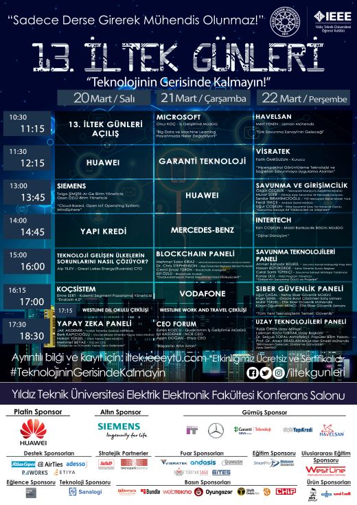 Devamını okuYTÜ IEEE Öğrenci Kulübü bu sene 13.’sünü düzenlediği İLTEK Günleri ile teknoloji dünyasının dev isimlerini öğrencilerle buluşturuyor. 13. İLTEK Günleri, 20-21-22 Mart 2018 tarihlerinde Davutpaşa Kampüsü Elektrik-Elektronik Fakültesi Konferans Salonu’nda gerçekleşecek.