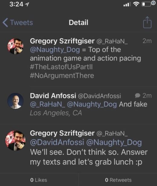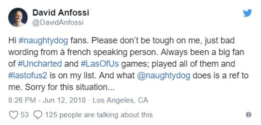 Her ne kadar Szrifgiser, Anfossi’nin yorumuna bozulmuşa benzemese de, oyunculardan gelen tepkiler sonucu Anfossi bir özür tweet’i atmak zorunda kaldı. "Merhaba Naughty Dog hayranları.” diye başlayan tweet, şöyle devam ediyor: "Lütfen bana yüklenmeyin, sadece Fransızca konuşan birinden kötü kelime tercihleri. Uncharted ve The Last of Us oyunlarının her zaman büyük hayranı oldum ve The Last of Us 2 listemde. Naughty Dog'un yaptığı şeyler, benim için bir referanstır. Bu durum için özür diliyorum..."