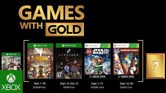 Prison Architect ve LEGO Star Wars 3: The Clone Wars 1 Eylül'den itibaren oyunculara sunulacak, Livelock ve SEGA Vintage Collection ise 16 Temmuz'da açılacak. Xbox One oyunları tüm ay boyunca indirilebilir durumda olsa da, Xbox 360 oyunları için bu süre 15 gün.