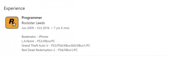 VG247'nin yakaladığı ekran görüntüsü, bu düşüncülerimizi destekledi. Eski bir Rockstar Leeds çalışanının LinkedIn profilinden alınan ekran görüntüsünde, geçmiş tecrübelerine "Red Dead Redemption 2 - PS4/XBox1/PC" yazdığı dikkatlerden kaçmadı. Tabii ki bu basit bir hata da olabilir ki zira sonrasında PC ibaresini kaldırmış ama tahminlerimiz Rockstar'ın Red Dead 2'yi bir yandan da PC için geliştirdiği ve oyunu, bu seneki çıkışından sonra o taraflara da getireceği yönünde.
