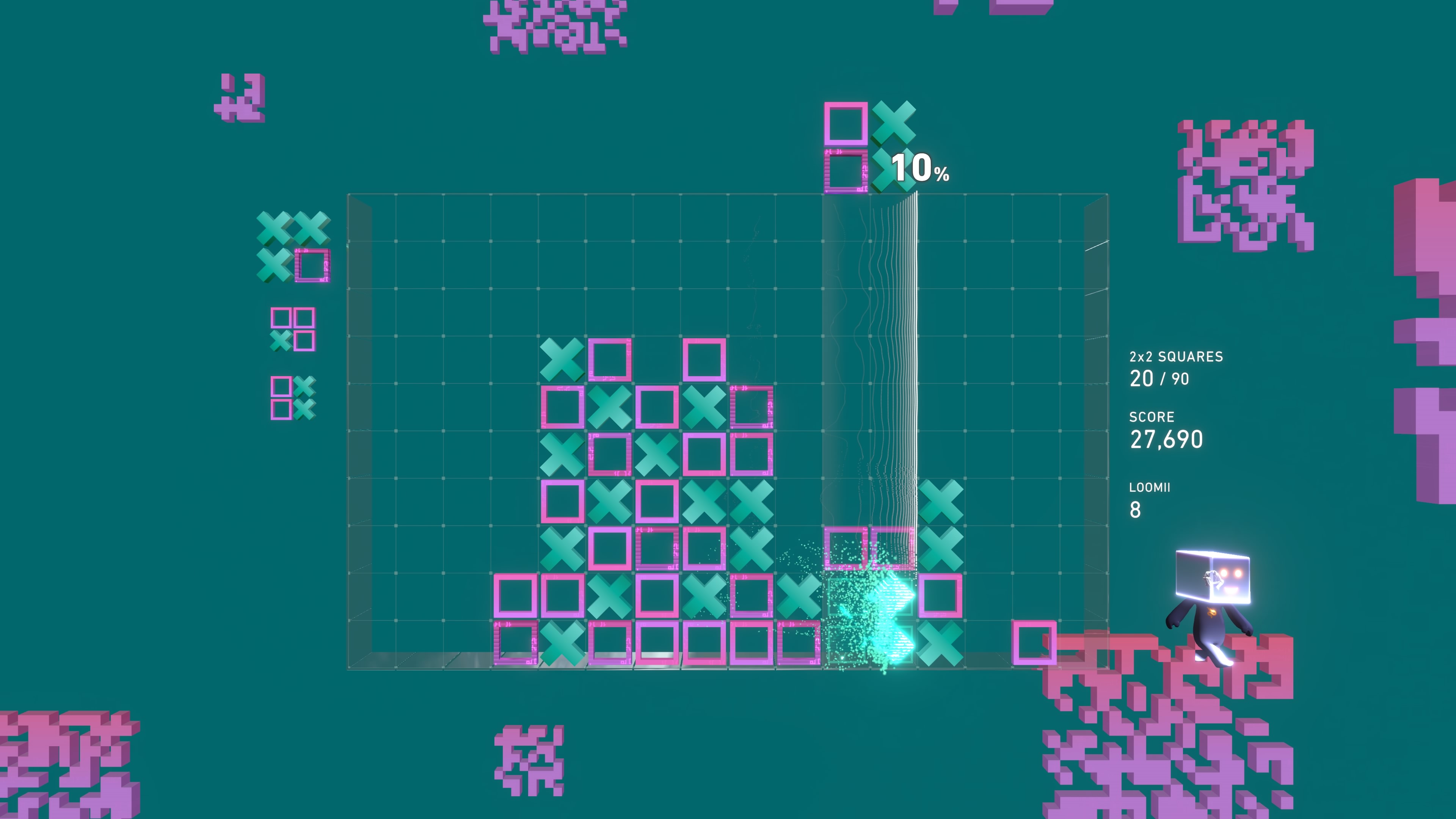 Lumines, tıpkı benzer türdeki diğer bulmaca oyunları gibi, temelinde basit bir mekaniğe sahip: İki farklı şekil var, o şekillerle en azından 2x2 kareler yap ve puan topla. Bu kadar. Gayet basit. Ama yine tıpkı benzer türdeki diğer bulmaca oyunları gibi, Lumines’in de ustalaştıkça derinleşen bir oynanışı var. Oyun alanını okumak, önceden plan yapıp parçaları uç uca birleştirip daha büyük kareler oluşturmak için alan oluşturmak, “+” ikonlu şekilleri doğru yere yerleştirip temizlemek… Bunların üstüne oyunun ritim temelli olduğunu da hatırlatmakta fayda var tabii. Şarkının hızına göre şekillerin de düşüşü hızlanıyor, hazırlıksız yakalandığınızda kaosun baş göstermesi gayet yaşanabilir durumlardan.
