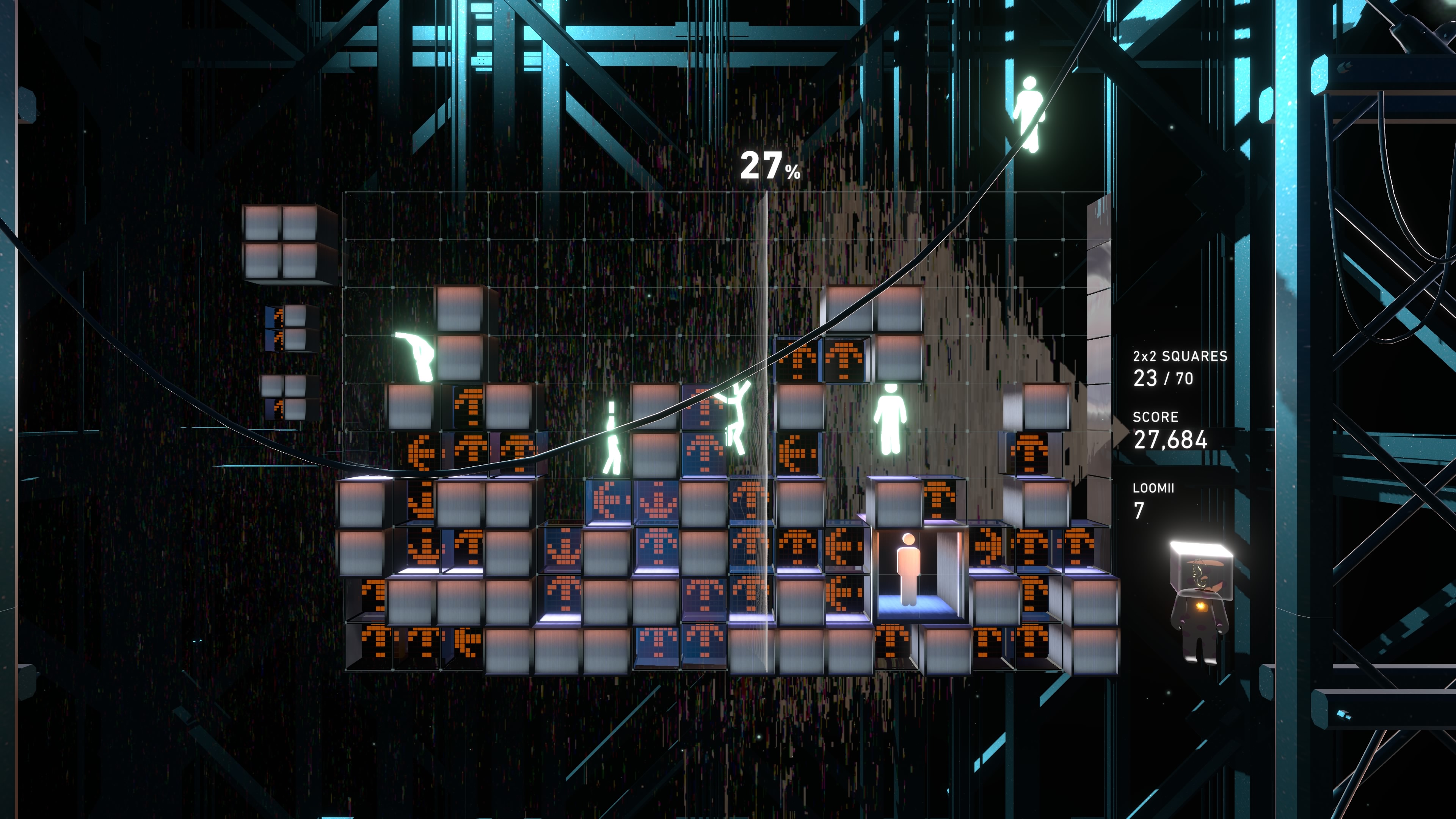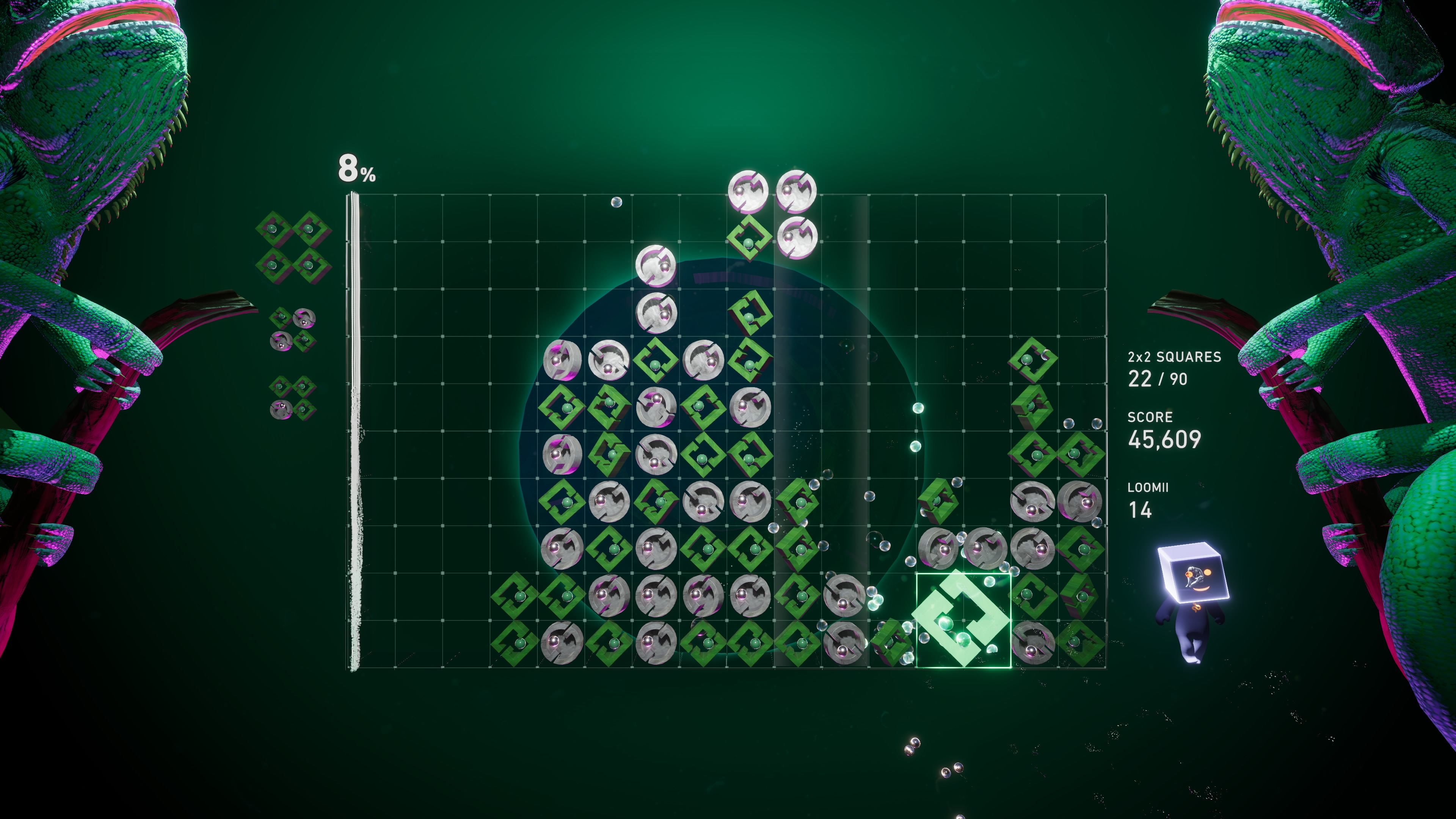 Oyunun nispeten Tetris Effect’ten alıp geliştirdiği noktalar da yok değil tabii. Mesela Tetris Effect’in kısıtlı özelleştirme seçeneklerini alıp bir hayli çoğaltmışlar. Loomi adında maskot bir karakterimiz var ve gerek oyunda bazı şeyleri tamamlayarak gerekse de oyunun kendi içindeki “gacha” sistemi olan Loomi-pon’dan ekipmanlar düşürerek hem Loomi’mizi hem de oyundaki profilimizi özelleştirebiliyoruz. Tetris Effect’te sadece hafta sonu görevlerine katılarak ya da seviye atlayarak açabildiğimiz basit avatarların bir üst noktası olmuş. Bu Loomiler tekli oyuncu modlarında da çoklu oyuncu modlarında da beliriyor. Oynanışa herhangi bir etkisi yok tabii. Gacha dediğime de bakmayın, aklınıza olumsuz bir şey gelmesin. Gerçek para verme gibi bir seçenek yok zaten, oyunu oynadıkça bu “gacha”yı kullanmak için gereken oyun içi para birimini topluyorsunuz.