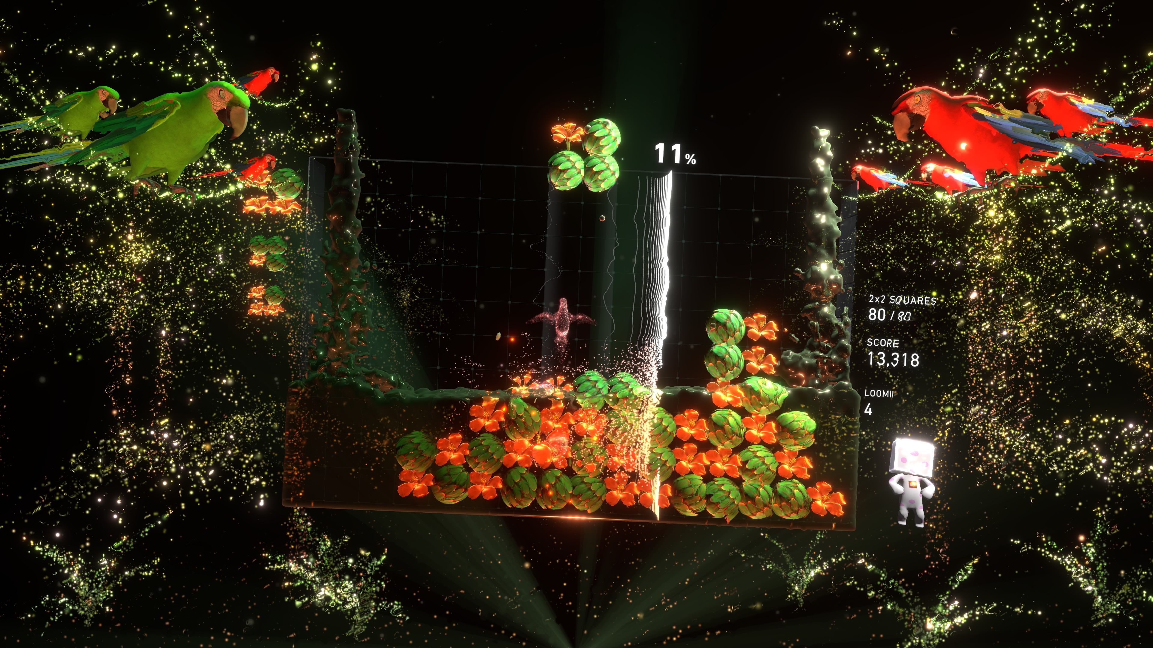 Lumines Arise’ın Tetris Effect’ten getirdiği yenilikler bunlarla da kısıtlı değil tabii. Oyunun “ana modu” olan Journey, tıpkı Tetris Effect’teki gibi. Dört ya da beş bölümü üst üste oynayıp, bu bölümlerin hepsini tek tek açıyorsunuz. Ve eğer orijinal Lumines’in ya da Tetris Effect’in “kafasının güzel” olduğunu düşünüyorsanız… Lumines Arise’ın kafası daha da güzel. Cyberpunk bir şehir temalı bölümler mi dersiniz, meyve – sebze temalı bölümler mi dersiniz, güvercinli bukalemunlu bölümler mi dersiniz… Oynarken arada “Ya şimdi bu ne alaka?” dediğim bolca oldu. Ama Tetris Effect’ten tecrübeli olduğumdan dolayı pek de yadırgadığımı söyleyemem. Orijinal Lumines gibi olsaydı sıkıcı bulma ihtimalim daha yüksekti hatta.