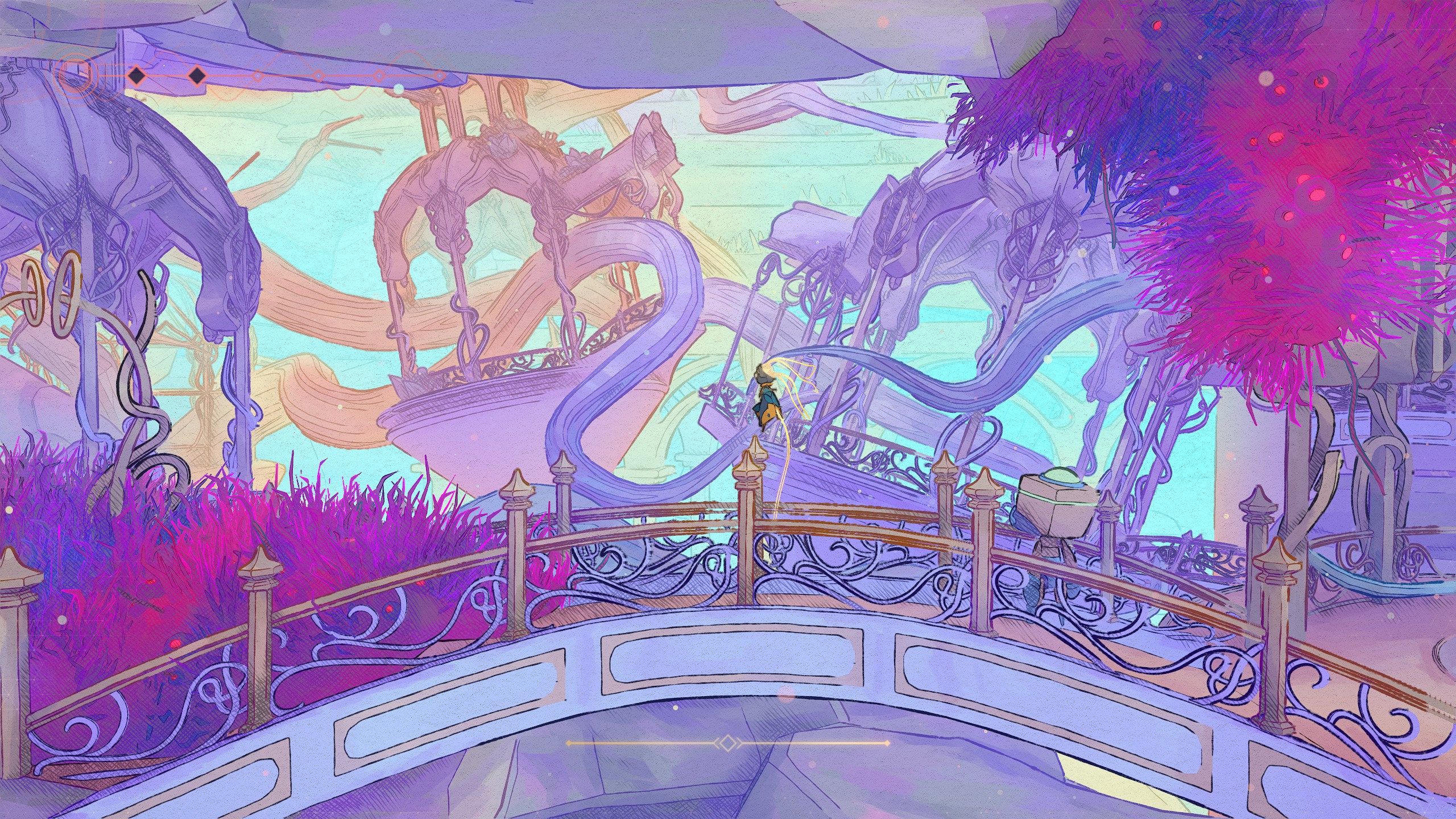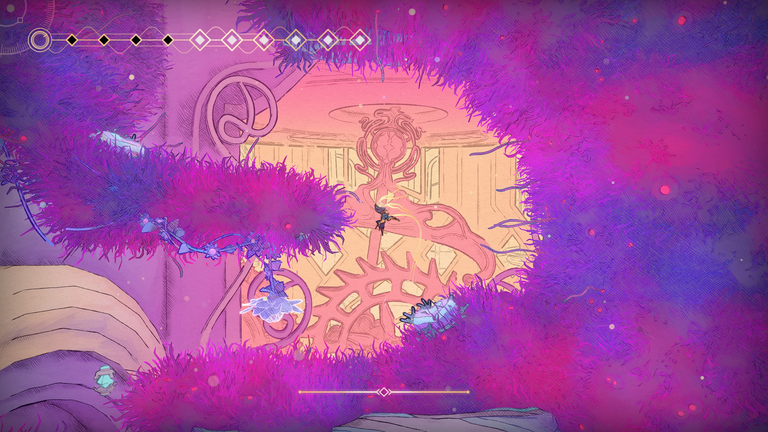 Ben aslında her şeyden önce oyunun inanılmaz görselliğini bir övmek istiyorum ya. MIO kesinlikle ve kesinlikle uzun zamandır oynadığım en GÜZEL Metroidvania ki buna Silksong da dahil. Sonradan renklendirilmiş karakalem el çizimi gibi duran grafikler, kullanılan renk tercihleri, tablolardan fırlamış gibi duran arkaplanlar oyunun çoğu yerinde durup hayranlıkla detayları incelememe yol açtı. Hani illa bir kıyas yapacak olsam aklıma gelen ilk oyun GRIS olurdu.
