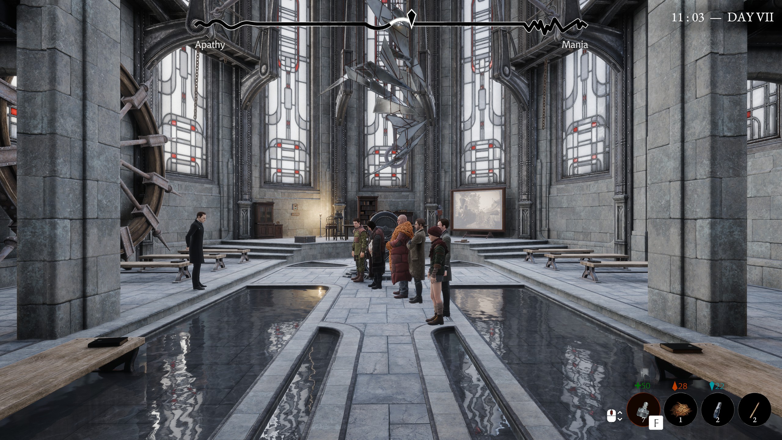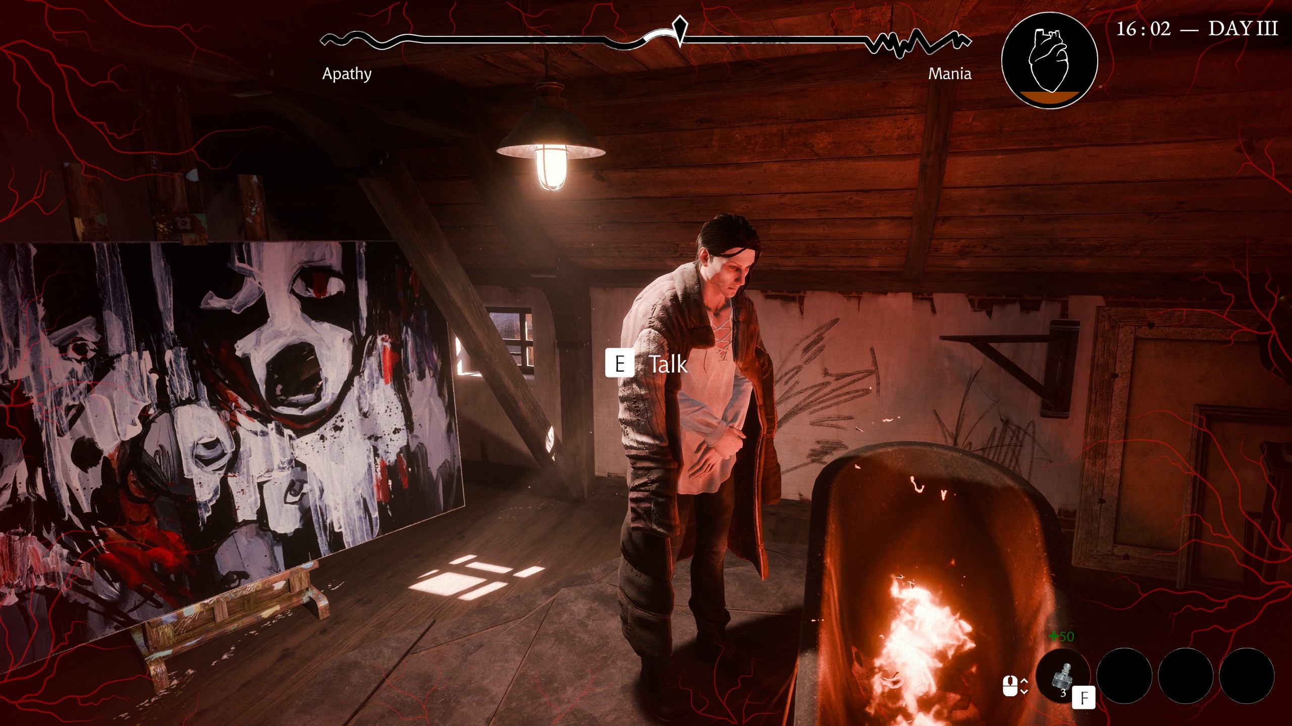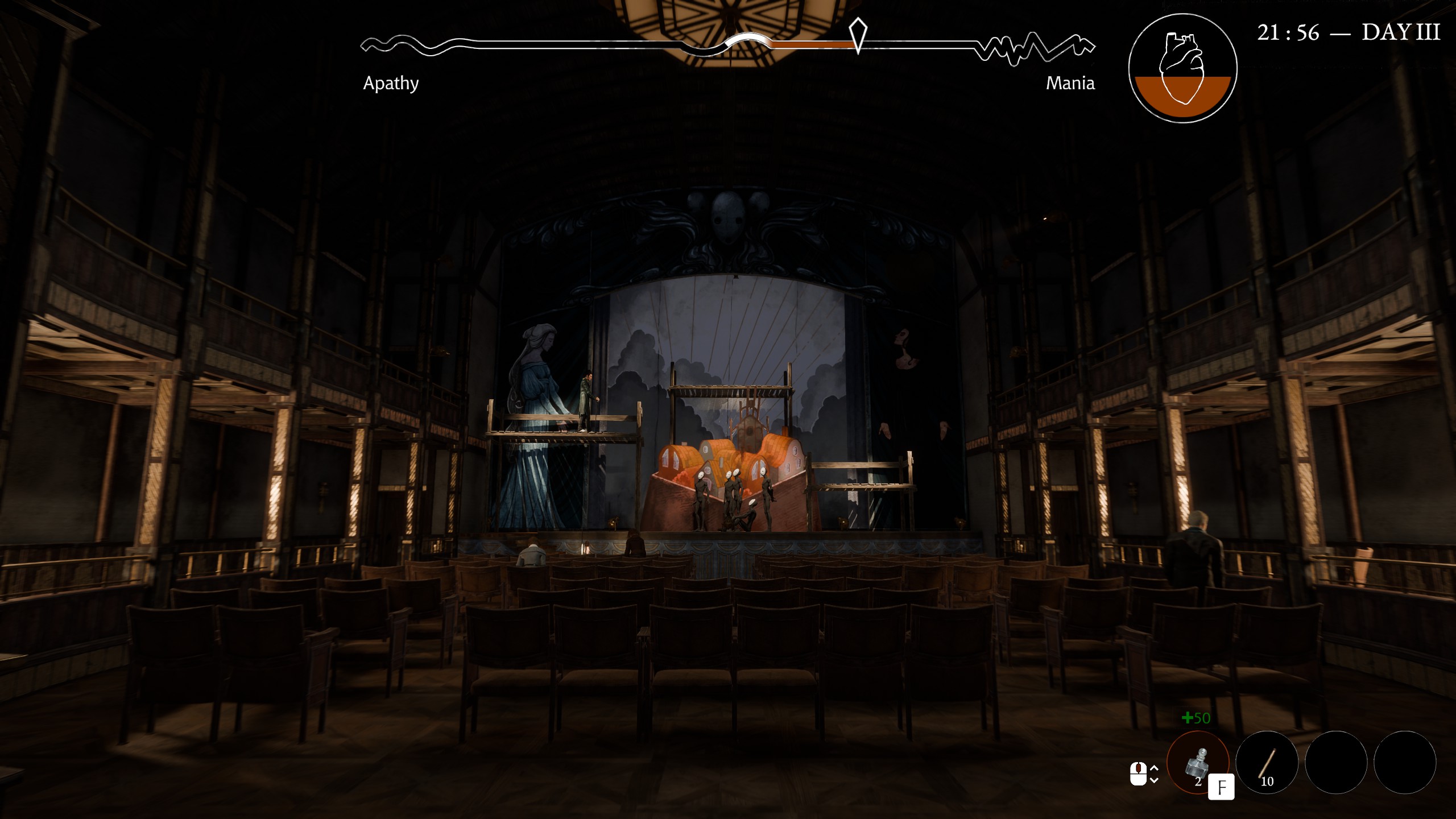 Pathologic 3, kendi köşelerine sahip olsa bile, çok daha rahat ve Bachelor’a uyacak şekilde “aklı bir karış havada” bir oyun. Dankovsky’nin yiyecek ekmek, giyecek çarık, milleti kesecek neşter bulma derdi yok. Oyunun başlarında kasabanın idaresi “Okumuş adamsın, bizi bu salgından kurtarsan kurtarsan sen kurtarırsın” denilerek eline teslim ediliyor. Sürekli büyük resme bakmak ve bakarken gördükleri yüzünden balatayı sıyırmamak için ruh halini yönetmesi gerekiyor sadece. Dankovsky’nin ruh hali “mani” ve “apati” olarak adlandırılan iki ekstrem uç arasında gidip geliyor. Mani halindeyken karakterimizin hareket hızı artıyor ama kalbi bunu pek kaldıramadığı için sağlığı yavaş yavaş azalmaya başlıyor. Ayrıca bazı karakter mani halindeyken sizinle konuşmuyorlar, sakinleşmeniz gerekiyor. Mani barınız tamamen boşalıp, karakteriniz kayıtsızlığa kayma başladıkça da hareket hızınız artıyor ve zaman yolculuğu yapabilmek için kullandığınız esas kaynak olan Amalgam yavaş yavaş erimeye başlıyor.
