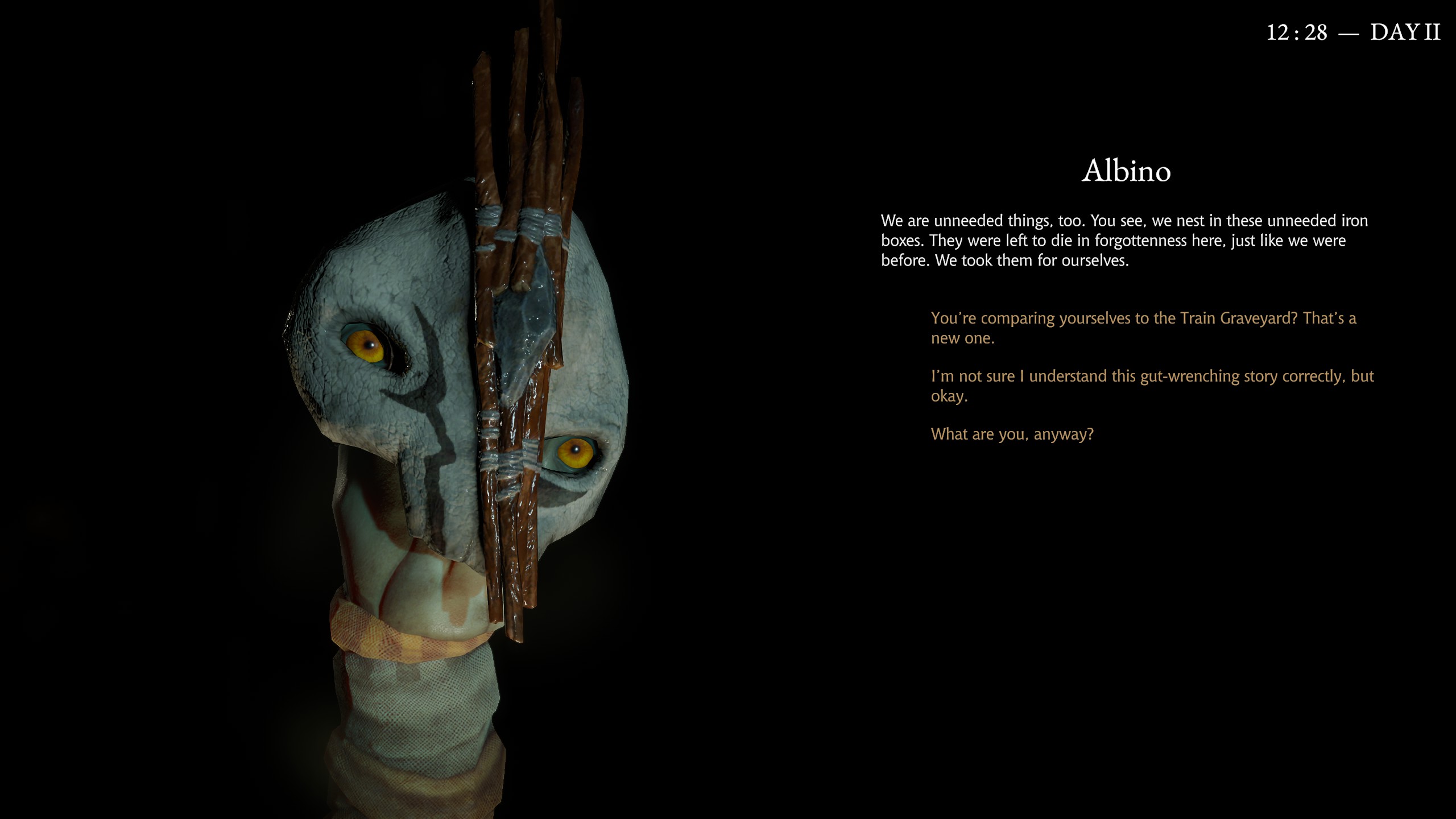 Apatiniz had safhaya vardığında da Daniil oyunun başında yaptığı gibi, bu durumlar için sakladığı ufak tabancayı çıkarıp “Hadi bana eyvallah” çekmeye hazırlanıyor. Bu noktada ekranda çıkan düşünceler arasında doğru olanları seçip Daniil’i Alt+F4 yapmamaya ikna etmeniz lazım. Edemezseniz geçmiş olsun, tekrar aynalarla dolu o odadasınız, Amalgam slotlarınızdan birisi çatladı ve bolca da Amalgam kaybettiniz. Ancak bu anlattıklarım kulağa çok zor bir oyun tecrübesiyle karşıyaymışsınız gibi gelmesin, karakterinizin ruh halini manuel olarak yönetebilmek Pathologic 2’deki hiçbir şeyin olmadığı kadar kolay. Sadece geliş geçişte etrafta gördüğünüz çöp tenekeleriyle kutulara baksanız, sağlık iksiri, yatıştırıcı ve uyarıcıların yanında, daha fazla kaynağı çocuklarla takas edip bulmanızı sağlayacak çer çöpü fazla fazla buluyorsunuz.