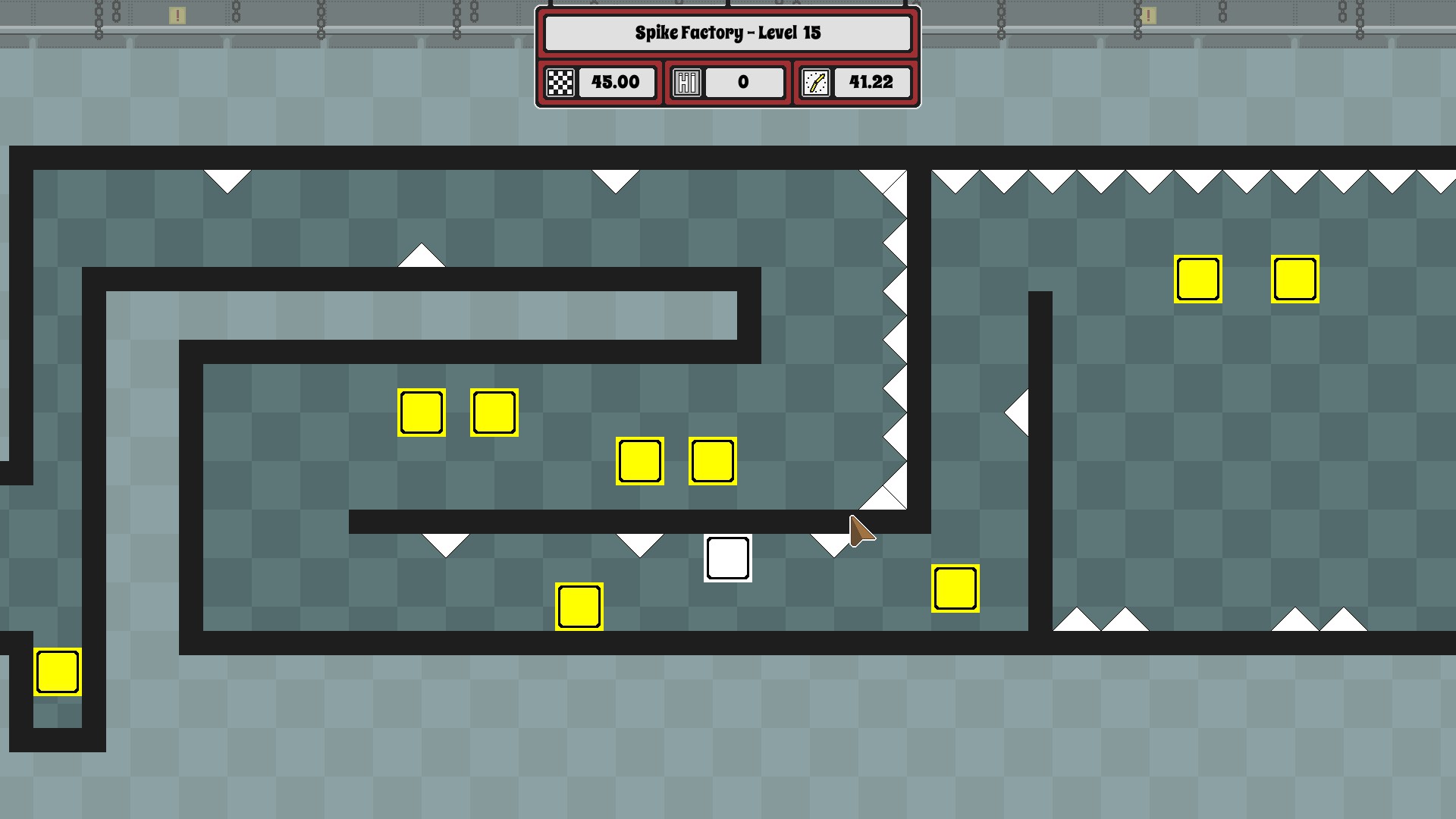 Bu noktada oyunun sunduğu öğrenme eğrisini beğenmiş olmakla beraber, bu değişimlerin zaman zaman daha hızlı gelmesini de istemedim değil. Yeni bir komponent eklendiğinde bölümün daha basit olması çok mantıklı. İşte önce sadece bir doğrultuda hareket eden kareler var, sonra duvarlara eklenen bazı dikenler geliyor ki bu tür oyunlara aşina olanlar bilecektir, duvarları hareket ederken bir dayanak olarak kullanmak oyunun akıcılığı için önemli. Sonrasında karenizi şişlemek üzere hazırda bekleyen dikenler geliyor falan…